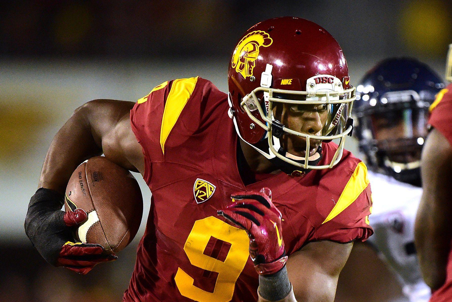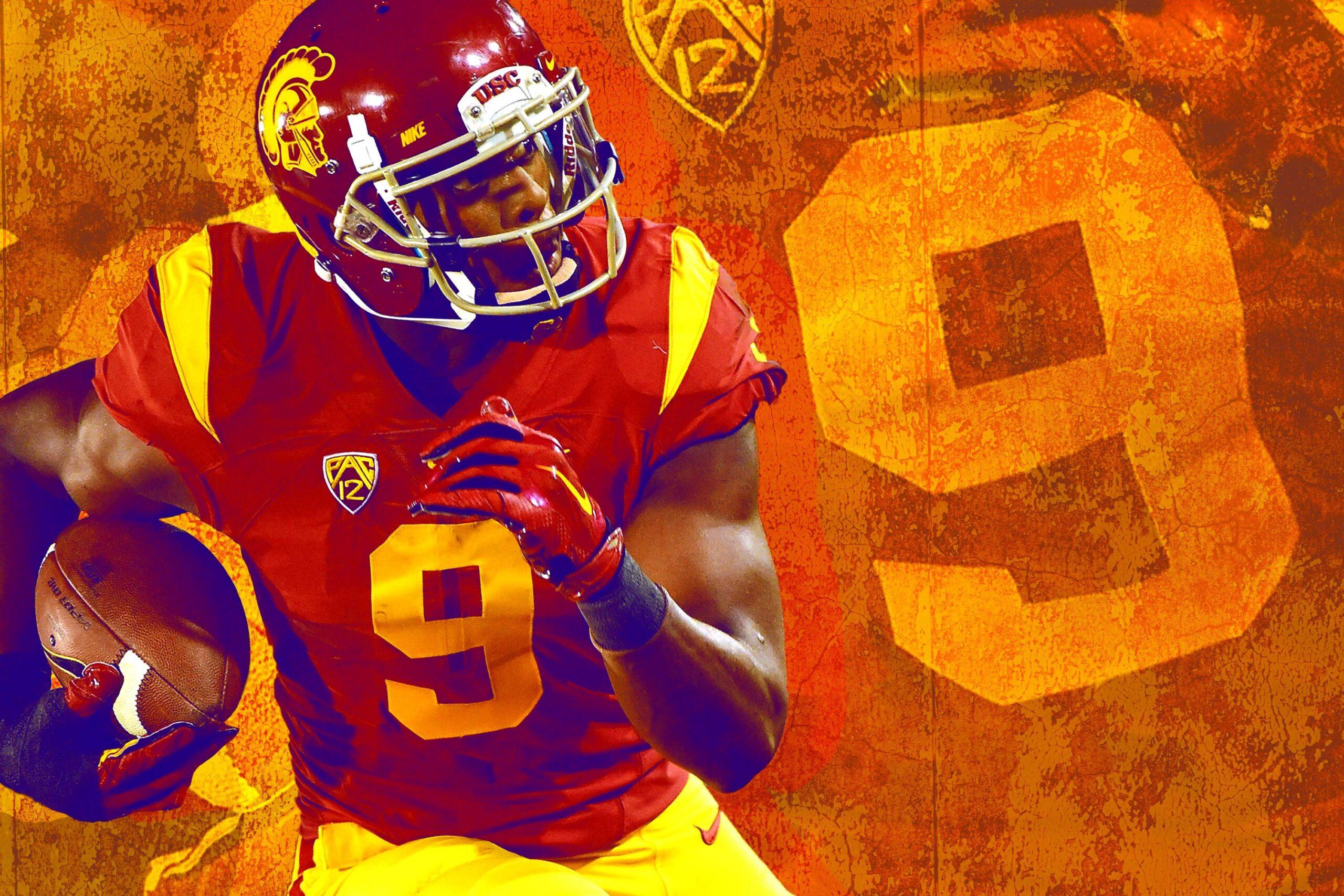 Smith-Schuster was a five-star recruit and the third-highest-rated athlete in the class of 2014, according to the 247Sports composite rankings, and he was as highly regarded at safety as he was at wide receiver. He had grown up a USC fan, living less than an hour south of Memorial Coliseum. Playing there had always been his dream. No other recruit, Martin said, would be more decked out in cardinal and gold gear during recruiting visits than Smith-Schuster. “Everyone my age wanted to be Reggie Bush. He was my idol,” Smith-Schuster says. “But coming up in high school and playing wide receiver, I wanted to be fast and quick like Marqise Lee, but I also wanted to be technique-sound and run really smooth routes like Robert Woods.”