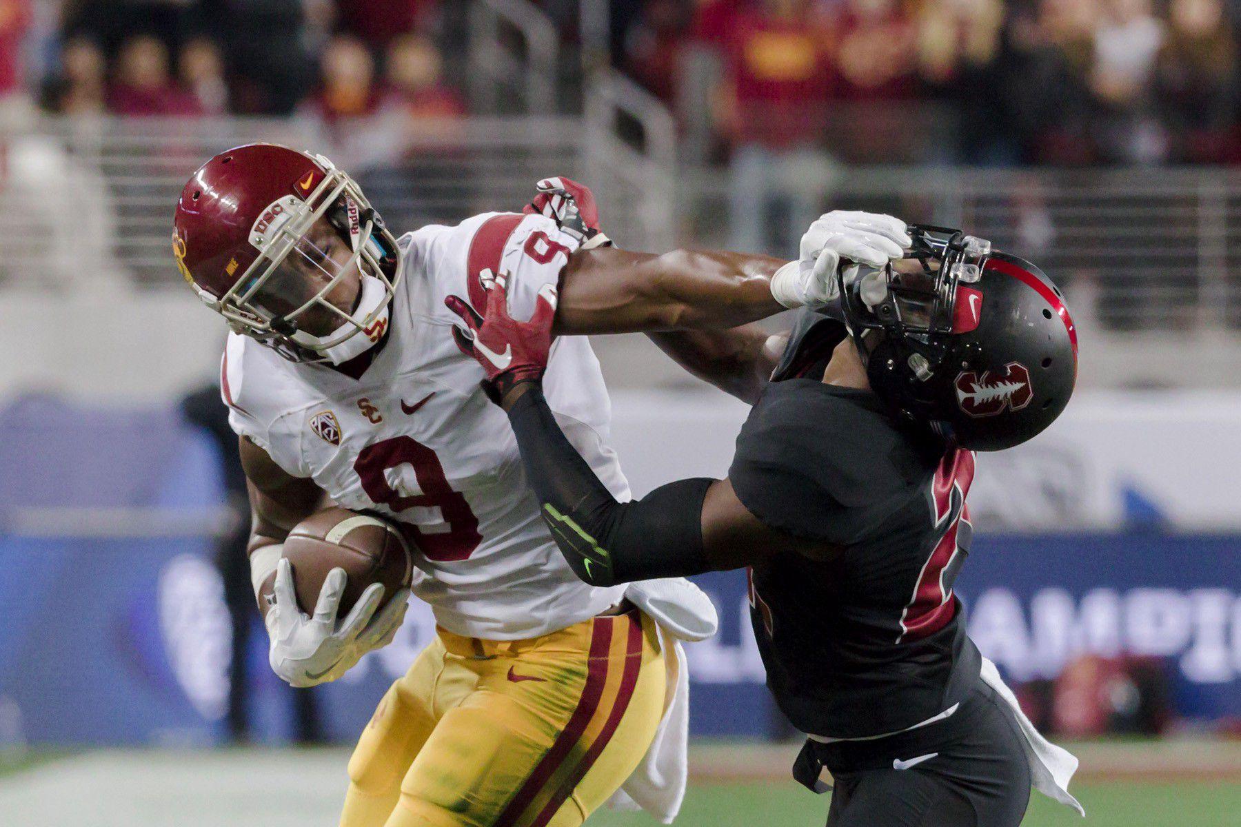 Ask Smith-Schuster about his stiff arm and he’ll laugh. His signature highlight came in the 2015 season against Utah, when he caught a ball on an underneath route, turned upfield, and sought out Utes defensive back Dominique Hatfield. Hatfield had been talking trash all game, asking Smith-Schuster why he was “trying to put him on SportsCenter.” Smith-Schuster did, sending the home crowd into pandemonium and his move into viral perpetuity.