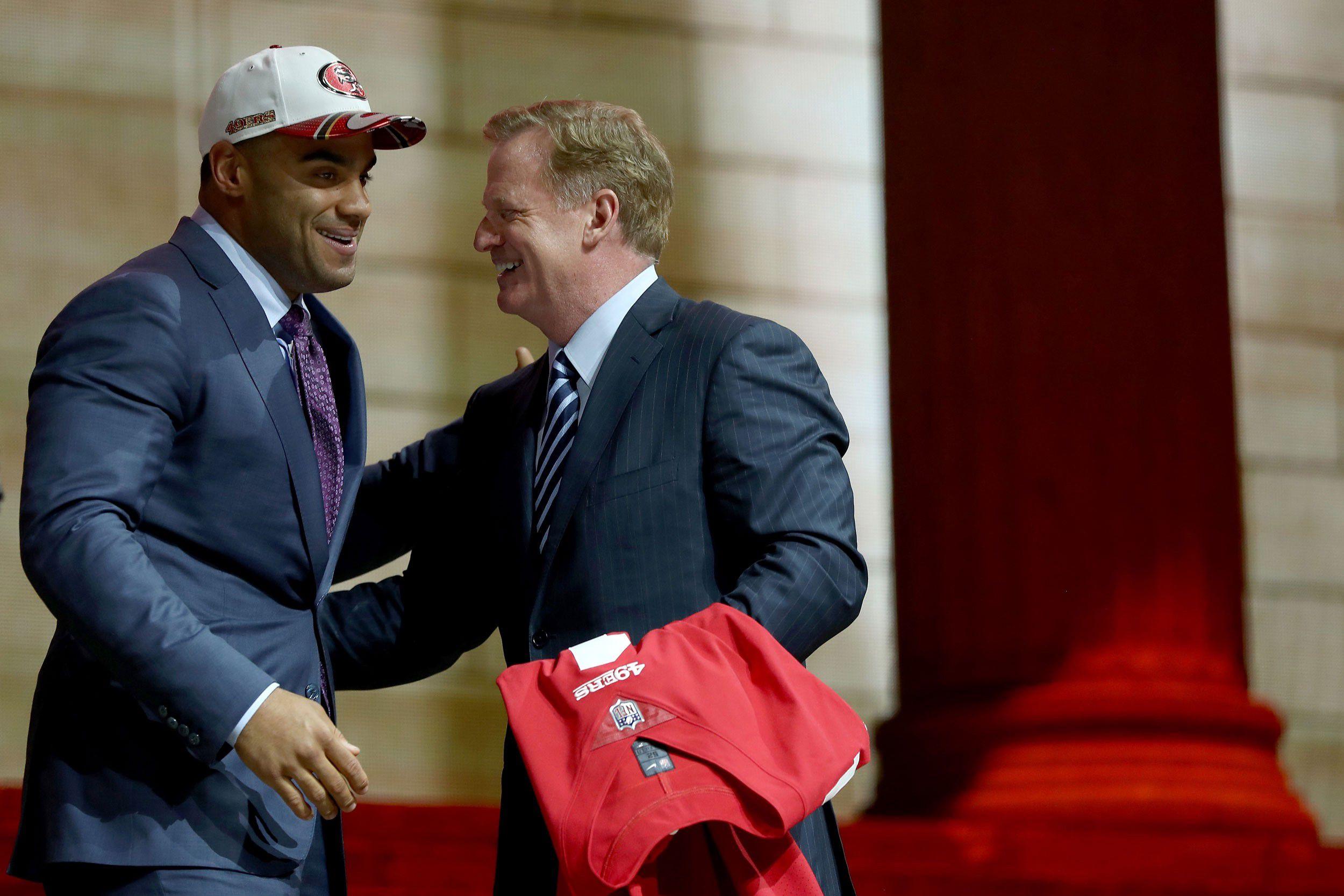 Foster’s stock tanked after he got kicked out of the combine for an altercation with a hospital worker and then later failed a drug test due to a diluted sample. He’s a top-10 talent and a day-one starter on the weak side of Robert Saleh’s defense in San Francisco. Next to NaVorro Bowman, the Niners now have a pair of three-down linebackers, both capable of playing the run and dropping back into pass coverage on third down. The 49ers had to give Seattle their early fourth-round pick to move back up into the first round, but if Foster’s bad offseason is more of a blip than a sign of things to come, GM John Lynch got amazing value with this pick.