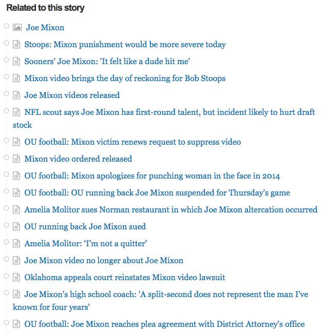 Google’s search recommendations aren’t actually recommendations. They’re aggregations of users’ most frequent queries, the website’s best guess of what you want to see based on what so many other people wanted, too. The search engine shows that for each peak of interest in Mixon, there’s a smaller, corresponding one for “joe mixon video.” The surveillance footage was shown to Oklahoma media by police in 2014 and then released to the public at the Oklahoma Supreme Court’s behest this past December, and as interest in Mixon has grown, so too has the desire to see what he did that night in Norman.
