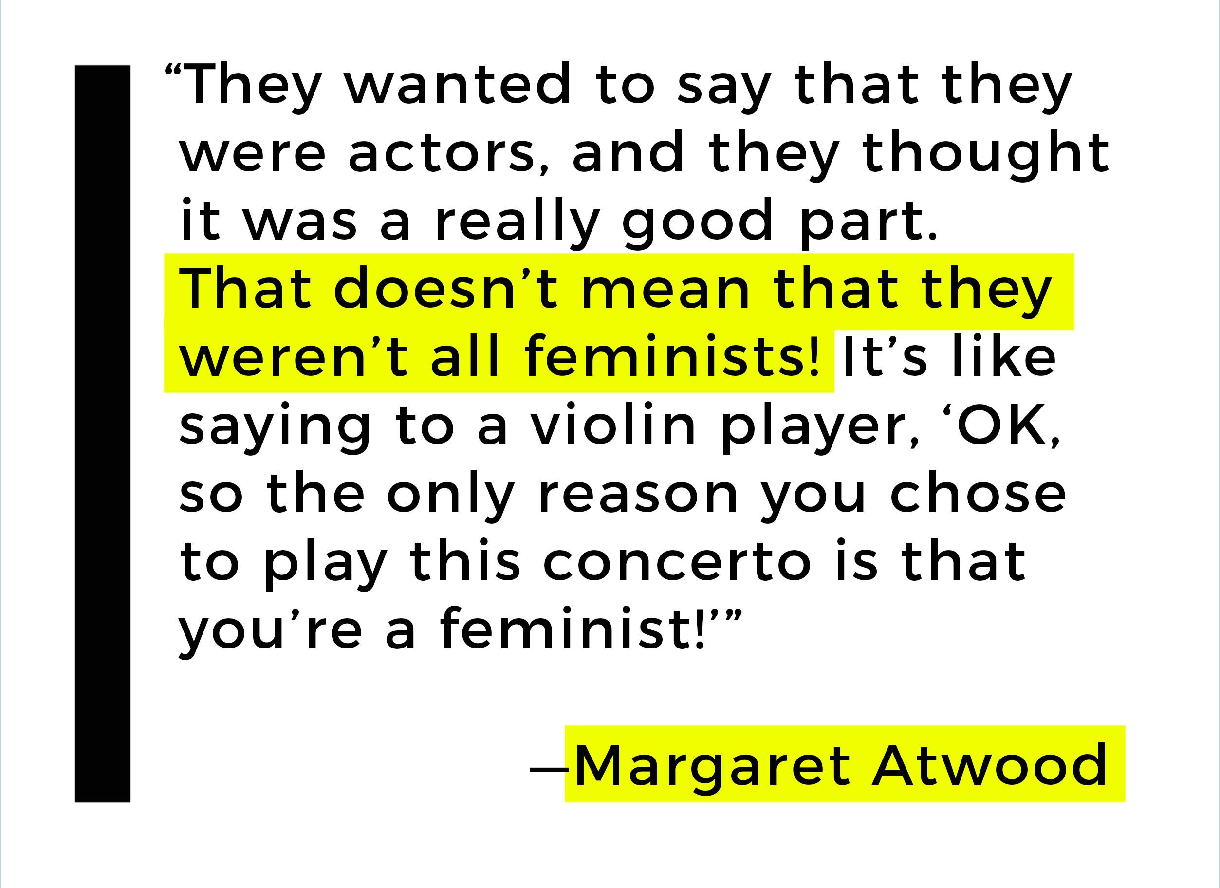 Atwood is quick to clarify on the actors’ behalf. “They wanted to say that they were actors, and they thought it was a really good part. That doesn’t mean that they weren’t all feminists! It’s like saying to a violin player, ‘OK, so the only reason you chose to play this concerto is that you’re a feminist!’ All they needed to say was, ‘It is not only a feminist story, it is also a story involving all human beings in it.’ Because of course, totalitarianisms affect everyone inside the totalitarianism.”