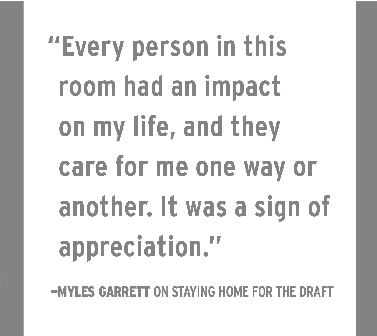 The TV’s sound returns just in time to fill the room with ESPN’s exploration of the Browns’ ineptitude everywhere on the field en route to posting a .306 winning percentage since 1999. Garrett stares at the screen impassively. When his own Texas A&M highlight film begins to play, he scratches his head sheepishly.