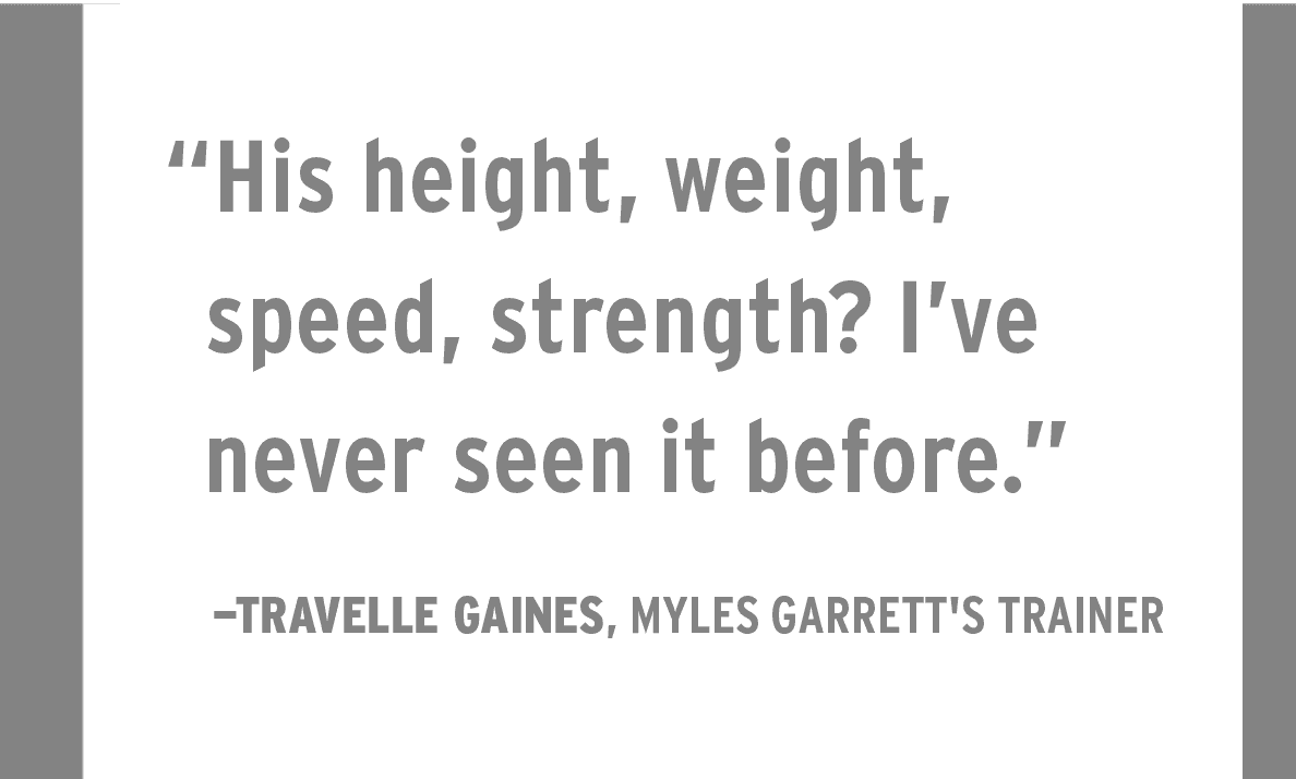 By late March, shortly after Garrett’s Pro Day and private workout with Cleveland, the Trubisky talk hadn’t dissipated, and Gaines had listened to enough. He called his friend Hue Jackson, now the head coach in Cleveland. Gaines had been wowed by Garrett’s quick response to his mobility drills: lunges, Romanian deadlifts, and one-legged squats. Before Garrett hit 100 pounds, the heaviest single-leg squat Gaines had ever seen was 80 pounds by Pro Bowler Donald Penn, the 315-pound Raiders offensive lineman.
