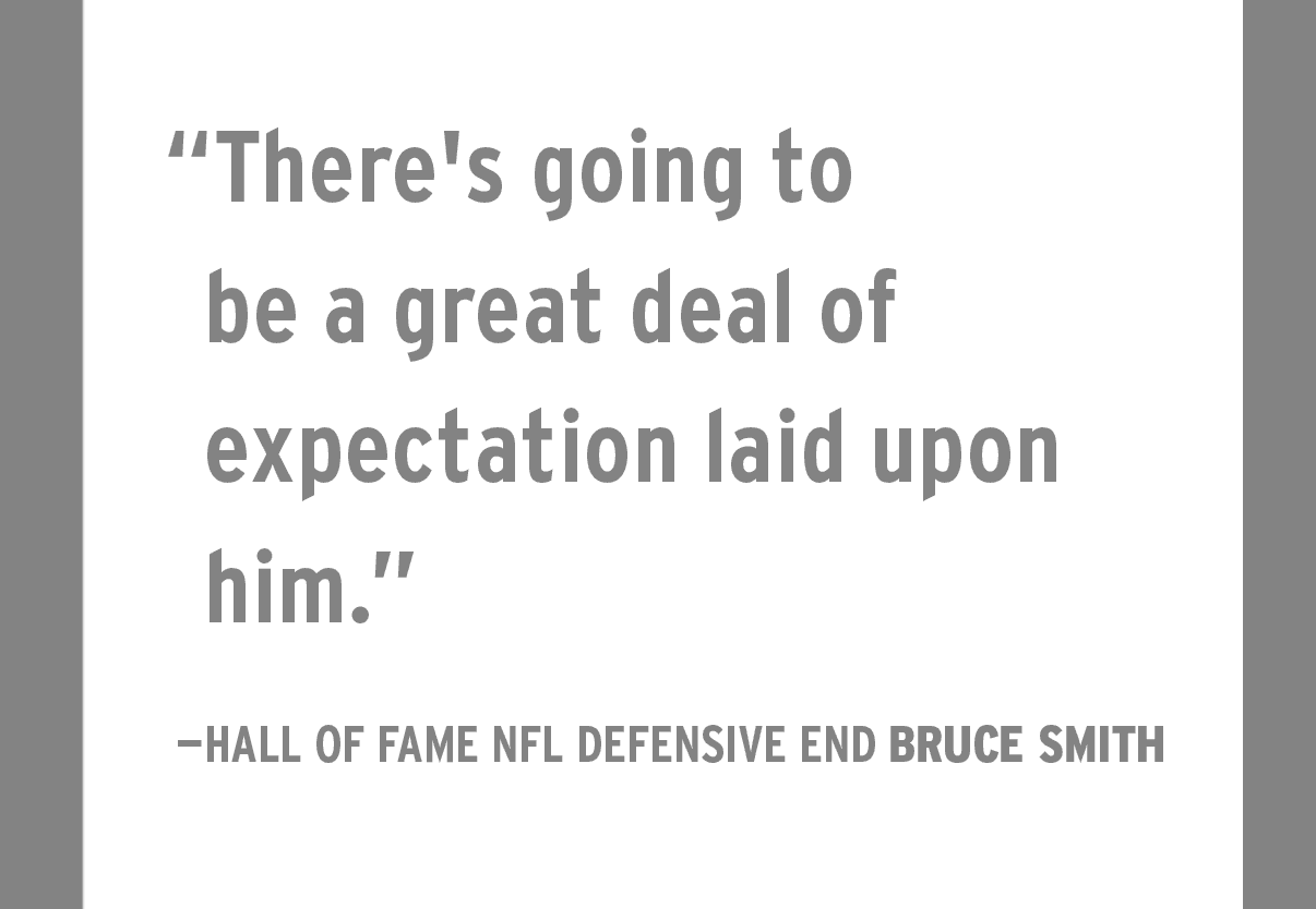 After spending one hour with Garrett earlier on draft day, Hall of Fame NFL defensive end Bruce Smith felt the same way. Audrey had surprised Myles by having Smith, his favorite pass rusher, over to the house for an hour to break down her son’s film. Smith recommended firing off the line of scrimmage quicker.