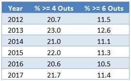 Nor have we seen any notable increases relative to recent years in the percentage of relief outings that have lasted at least four outs or at least six outs:
