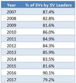 This time I calculated the percentage of leaguewide saves before May that were recorded by the 30 teams’ saves leaders. The 2017 Mariners, for example, have four saves, all of them earned by Díaz, their saves leader. I identified each team’s Díaz equivalent, combined their saves totals, and then divided the resulting figure by the sum of all saves in the season to date. The results seemed suggestive, so I went back 10 previous seasons instead of five. The finding held up.