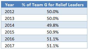 Again, no change, at least relative to last year. Which mostly make sense: Not only does a six-month regular season with few days off impose constraints on how hard teams can push pitchers, but valuable long relievers have to be built to break the mold, which can’t happen on a huge scale in one winter. As Devenski told us about his time in the Astros system, "I was kind of developed for this. … I did a lot of different roles in the minor leagues. We had this thing called piggybacking, which was a starter would go five innings, and a reliever, which would be a [regular] starter, would go four innings, and it would be vice versa the next time around."