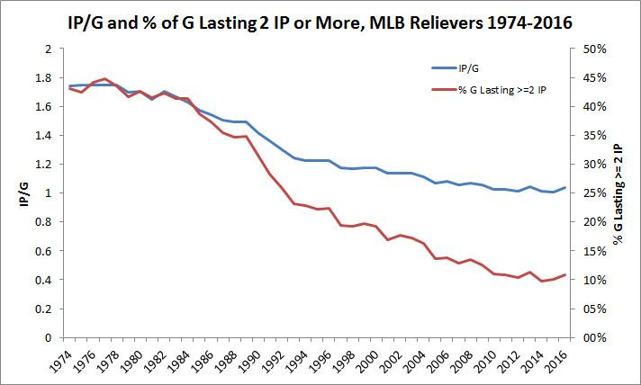 In an article in March, I ran the following graph, which shows how the length of reliever outings has declined over the past four-plus decades. Both the duration of the average appearance and the percentage of appearances lasting two innings or more have declined dramatically over that span, although they’ve plateaued lately.