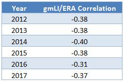 If managers haven’t been riding their relievers harder, have they at least been deploying them more optimally? Here I looked up the average pre-May "gmLI," or leverage index when entering the game, of every reliever from 2012–17 who had a preseason PECOTA projection. Then I calculated the correlation between their projected ERAs and their pre-May leverage indices. In theory, the lower the pitcher’s projected ERA, the higher his leverage index should be (because his team would want him pitching in the pressure-packed situations that earn higher LIs).