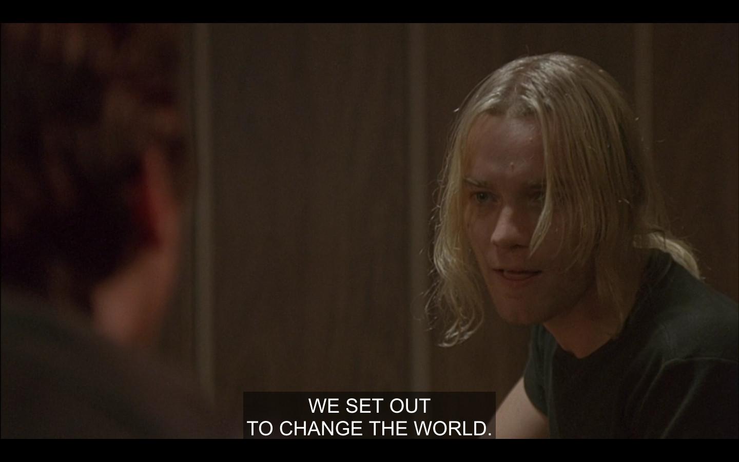 There he is, and, uh, there it is. Velvet Goldmine is a gorgeous, prurient, corny, intermittently enrapturing mess. Jonathan Rhys Meyers stars as the lightly fictionalized David Bowie analogue Brian Slade; McGregor is in the Iggy Pop role as Curt Wild, who looks and sounds an awful lot like Kurt Cobain. The music is killer, the pageantry is stunning, the drama is ludicrous. Half the time Christian Bale is supposed to be playing a teenager. But McGregor commits to all of it, howling through “Gimme Danger,” and, at the dramatic conclusion, delivering this profoundly stupid line …