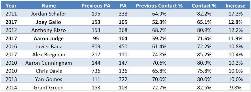 That takes us up to the third of the three promised statistical tables. This one, which again pulls from the 2008–17 pitch-tracking era, shows the largest single-season improvements in contact rate in more than 100 plate appearances by hitters who entered a season with at least 90 combined PA in previous years.