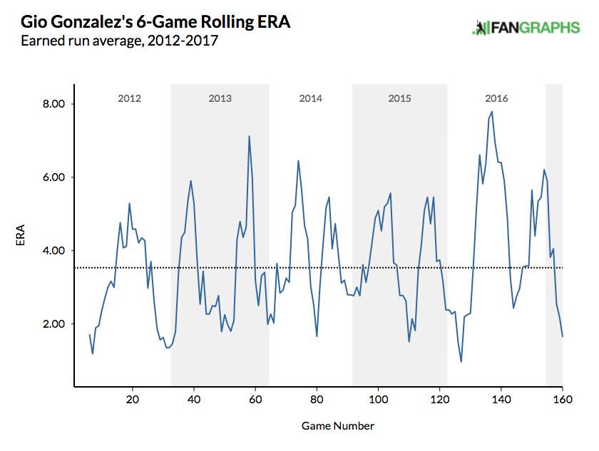 That’s about where the encouraging news ends. González’s underlying numbers might be worse than Miley’s: He hasn’t walked hitters so frequently since his 34-inning debut in 2008, and he hasn’t struck out hitters so infrequently since 2010, when the leaguewide strikeout rate was much lower. González is succeeding with a 92.2-percent strand rate — even higher than Miley’s — and a .257 BABIP that represents the lowest mark of his Nationals tenure. His Gibsonian ERA sparkles, but FIP is a better indicator of future performance, especially this early in the season, and no qualified starter has overperformed his FIP by a greater margin than González. By FIP, González (4.11) has been about as effective as Wei-Yin Chen and Jhoulys Chacin, which is about where he’ll settle once his luck reverts to normal. He’s had stretches with a miniscule ERA before in Washington but has never preserved them for long.