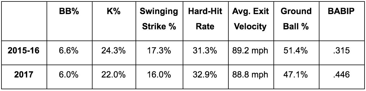 Cincinnati’s third baseman was roughly a league-average hitter in his first three seasons in the majors, but like García, he’s boosted his stock with one of the best starts to 2017 for any hitter. Suárez’s .322/.408/.611 line has him thumping the ball as well as Nelson Cruz this year, and unlike with García, his underlying numbers suggest that he’s adopted actual changes to his approach, rather than relying on batted-ball luck.