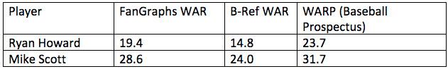 Scott’s career arc was almost a mirror of Howard’s: He debuted at 24 but was below-average every year until his age-30 season, while Howard first broke into the Phillies’ lineup at 25 and was pretty much finished by 32. It’s difficult to compare the two statistically, not least because Scott was a pitcher in the 1980s and Howard was a first baseman in the 2000s and 2010s, but also because Howard lost several wins at the end of his career by playing out the string on a bad Phillies team that kept trotting him out no matter how slow his bat got. Even so, we can compare their career WAR totals directly: