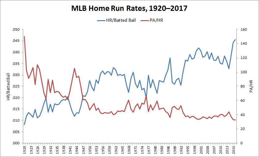 I noted in March that baseball’s home run rate was up slightly in spring training, relative to last spring. Through the first five-plus weeks of the regular season, the same has held true. However you slice the stats — plate appearances per home run, home runs per batted ball — last season’s home run rate was the highest ever. Thus far, this year’s has been higher still, even though home run rates are usually lower early in the season, before the weather warms up and the ball flies farther. All indications are that we’re headed for another new season-long high.