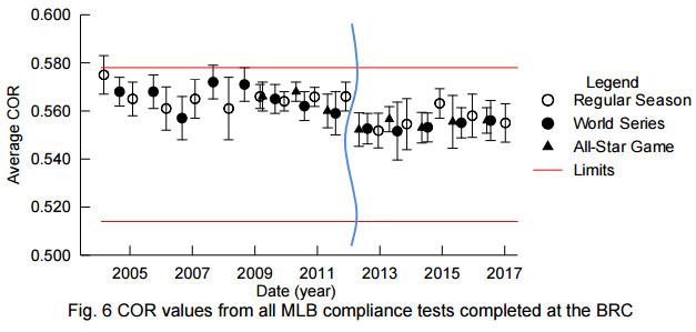 The report says that all of the baseballs were not only well within the limits of MLB’s fairly broad manufacturing specifications, but also “comparable in weight, circumference and COR to previous compliance data,” an assertion supported by plots of average values and 95 percent confidence intervals for each of the previous testing periods. The COR graph below — which I requested (and was granted) permission to share — is one of the document’s many nonsmoking guns. (The squiggly blue line marks a point in the 2012 offseason when the test conditions switched from balls being fired at 85 feet per second into a solid ash block to balls being fired at 88 feet per second into a solid steel plate.)