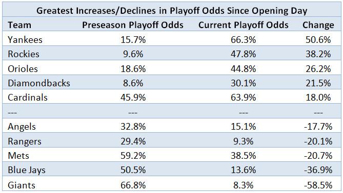The Yankees, who’ve improved their playoff odds more than any other club, have played like the best team in baseball, scoring the second-most runs in the majors while allowing the third fewest. They’ve outslugged other teams despite the almost-month-long absence of Gary Sánchez, a 6-for-60 start by Greg Bird and, briefly, the presence of Pete Kozma, and they’ve managed great run prevention despite a combined ERA above 5.00 from Masahiro Tanaka and CC Sabathia.