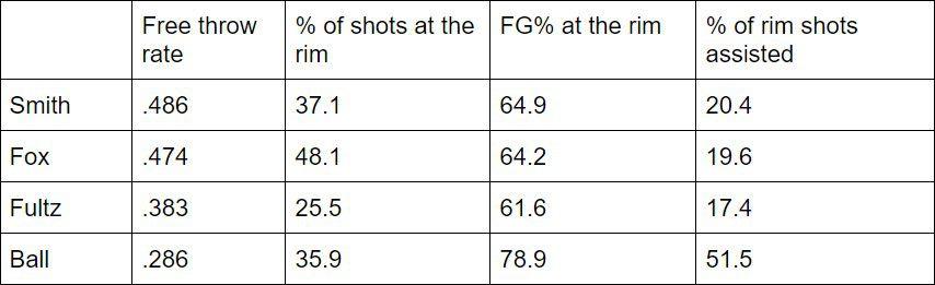 Smith is a well-rounded offensive player. He can attack the rim, finish through contact, get to the free throw line, and knock down 3s off the dribble. He leads the elite point guards in this year’s draft in free throw rate, and trails only Fox when it comes to the percentage of shots he takes at the rim. The only one with a higher field goal percentage at the rim was Ball, and over half his shots were assisted, an indication of how well UCLA spaced the floor and moved the ball, and how many different threats the Bruins had on offense (numbers courtesy of hoop-math.com):