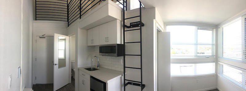 The room Cristian shows me is small, though not as small as I expected. It’s a lofted unit, so the ceilings are raised. The city didn’t zone the space for a bed to be put in the lofted area, so there’s a sign that says "Storage Only" leading up to the loft. Tenants can decide for themselves whether to put a mattress up there. There’s a small table and a desk, both of which fold up; against the wall, there’s a microkitchen with a sink, a minifridge, and a microwave. The bathroom is huge — it’s bigger than mine. Zoning laws, I’m told. I try to picture my furniture in this space; my bed certainly wouldn’t fit and neither would my kitchen table, but I could pare down and make this work. For less than $2,000 in the Bay Area, I’d be thrilled to.