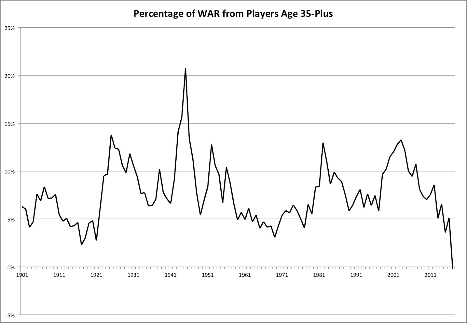 The plummeting performances also aren’t entirely attributable to the disappearance of good players from the pool. David Ortiz and David Ross retired in the offseason and Adrián Beltré hasn’t played yet this year due to injury, but every other effective 35-plus bat from last season is still around, and the most valuable 35-plus pitcher last year who hasn’t appeared in 2017 is Jake Peavy, who was worth only 0.9 WAR and managed a 5.54 ERA.