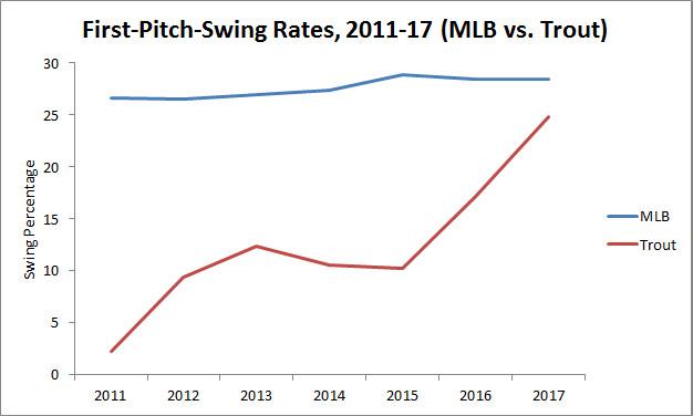 Just two years ago, Trout swung at pitches directly down the middle a little more than half the time. This year he’s swung at more than 80 percent of such pitches. A large part of the increase in Trout’s overall swing rate stems from his much less passive approach on the first pitches of his plate appearances. Trout started out as a statue on first pitches, but this season he’s swinging almost as often as a league-average hitter.