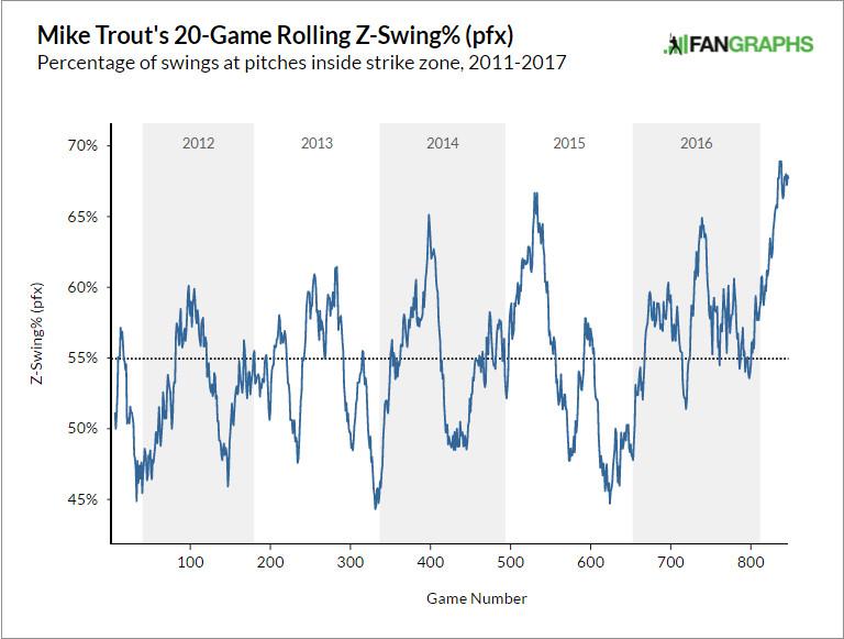 Instead, Trout has gotten aggressive in a good way, continuing (and even accelerating) a trend he started last season. Trout’s overall swing rate is the highest it’s ever been, but his rate of swings at pitches outside the strike zone is either at its nadir (according to Baseball Prospectus) or very near its nadir (according to FanGraphs). Almost all of the uptick comes from an increase in swings at pitches inside the zone. At no point in his career has Trout swung at strikes this often over so long a span.