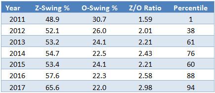 This is even easier to see on heat maps of Trout’s swing rates by pitch location. The GIF below juxtaposes Trout’s swing rates in 2015 with his swing rates this season. The darker red shading in the 2017 image indicates that Trout has started swinging much more frequently in those central regions.