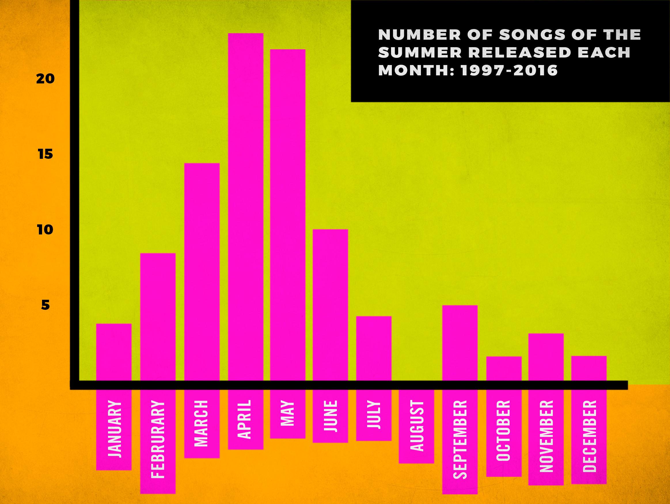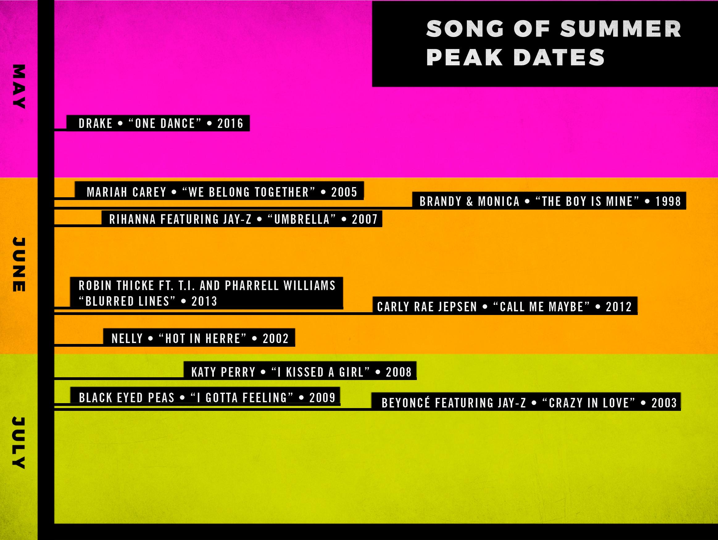 The date might seem early, given that summer doesn’t technically start until June 20, but Timberlake was highlighting a key indicator: release date. In the recent 20-year history of Songs of Summer, nearly 50 percent of the most popular tracks have been released in April or May, with the overall average release date being May 11.