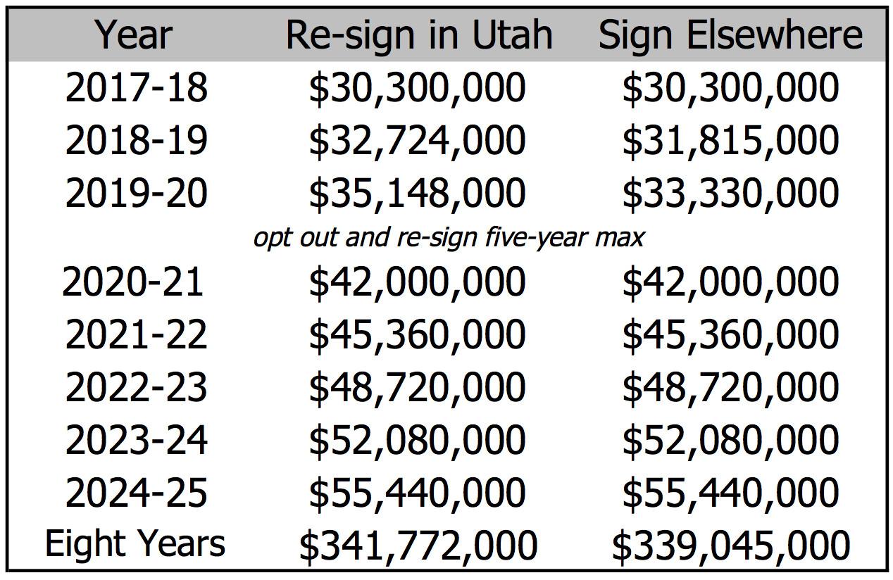 Here’s how Hayward’s contract could look over the next eight years by re-signing in Utah this summer and then signing a five-year max in 2020, versus signing elsewhere and then signing a five-year max in 2020.