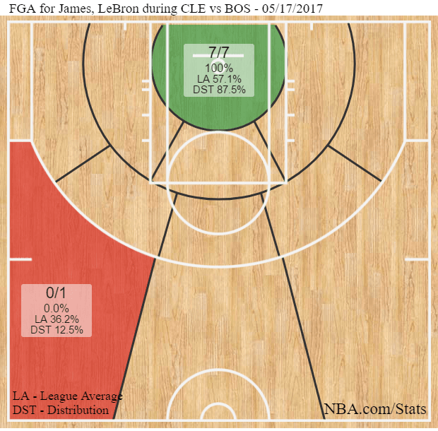 LeBron has had his way with the Celtics over the past few years, and that physical dominance continued in Game 1, which he finished with 38 points on 14-of-24 shooting, nine rebounds, seven assists, and two steals. It was the closest thing to the way Shaquille O’Neal used to dominate teams in the early 2000s: LeBron was physically superior to every player in the Celtics rotation by a significant margin, and he wasn’t going to bail them out by settling for anything other than dunks and layups. Take a look at his shot chart from the first quarter: