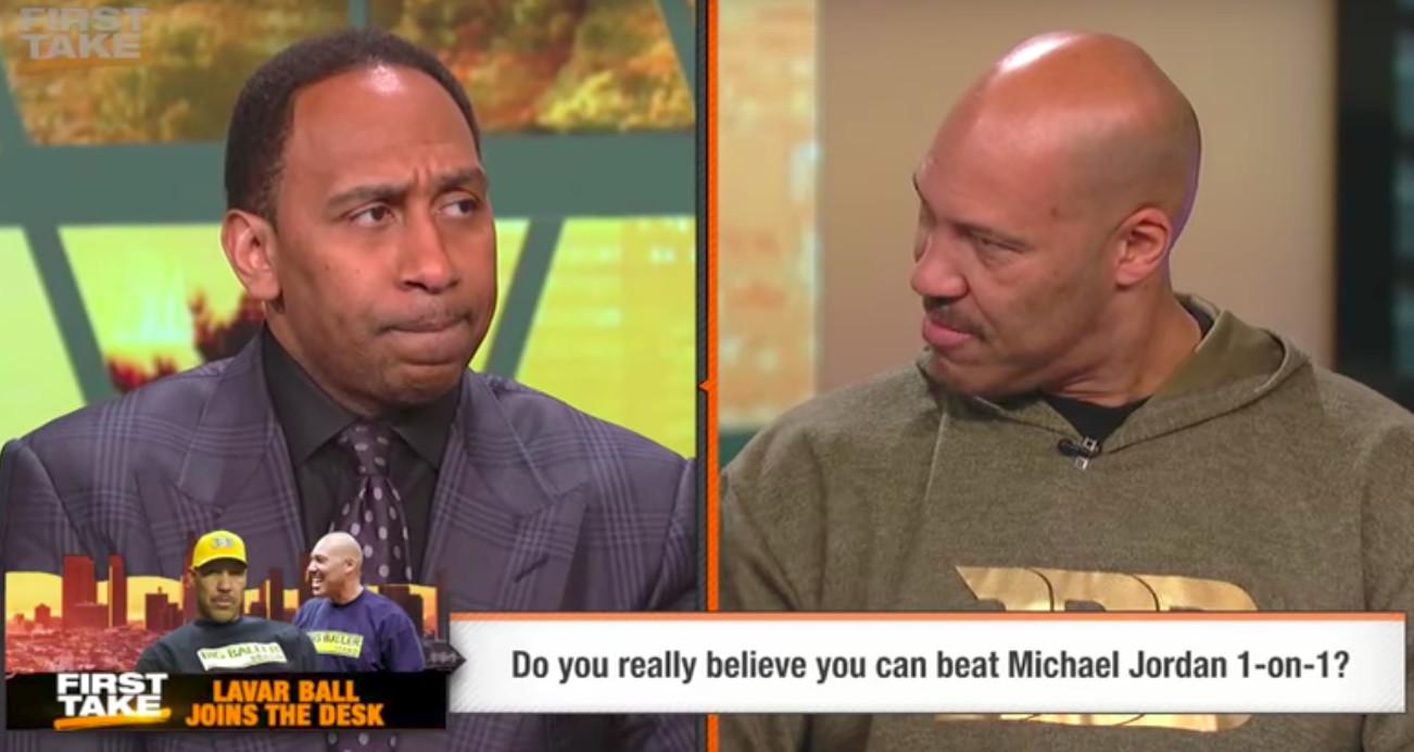 In late March, the first time he went on First Take, Lonzo’s dad said all sorts of things that had no material impact on anything outside of those studio walls — things that couldn’t possibly happen in real life. We all saw him throw a pass to himself off the backboard in a pickup game because he picked up his dribble too early. So the idea that he’d beat MICHAEL JORDAN, IN HIS PRIME — like his idea that Steph Curry would “shoot UCLA out of the game,” or that Curry is “too little” for the point guard position, when he’s just about prototypical size at 6-foot-3 and 190 pounds — is little more than hot air and pride.