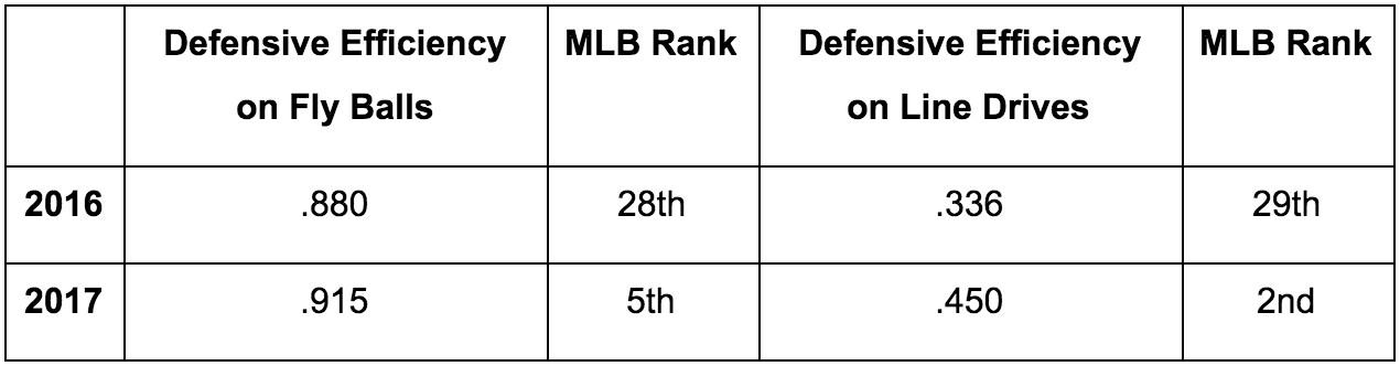 The personnel changes in the outfield boosted the Twins’ ability to catch all manner of balls in the air, from liners to gappers to rangy fly balls. The effect is noticeable on aggregate, too, and not just on highlight reels.