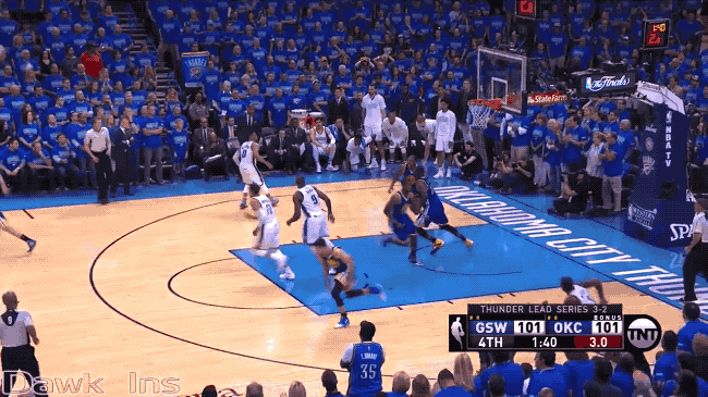 After taking a 3–1 lead in the Western Conference finals, the Thunder dropped the fifth game and were headed back to Chesapeake Energy Arena in the hope that they could close out the series and advance to the organization’s second Finals. It seemed likely if not probable. Steph Curry’s shooting had been reduced to mere human-level accuracy, and the Thunder led through the first 44 minutes of Game 6. With 5:48 left in the final clip, up 94–87, Russ and KD had an 88 percent chance of advancing.