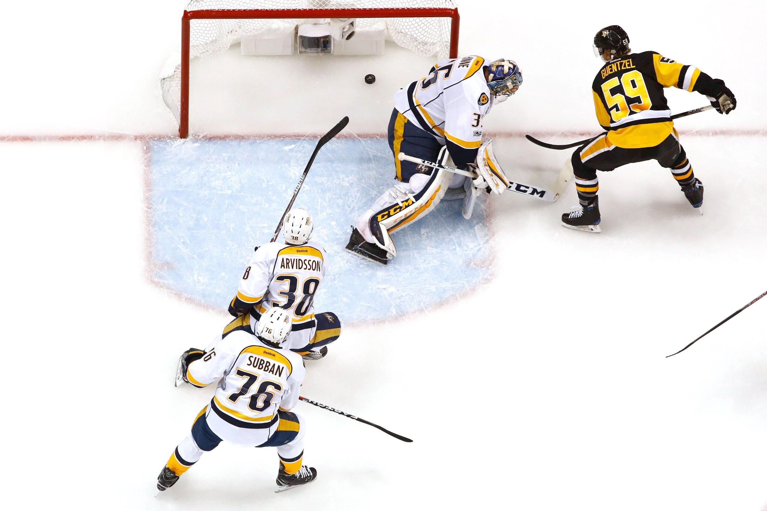 In the third period of Game 2, the Preds’ hope turned into dread in an instant — or, to be precise, in 10 seconds, which is how long it took Penguins rookie Jake Guentzel to score the go-ahead goal. After Pekka Rinne bounced a wild rebound off a Bryan Rust shot into the center of the ice, Guentzel finished into a gaping net to put Pittsburgh up 2–1.