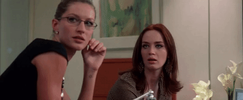 The Mirror Shot: It’s great: Emily Blunt and Gisele Bundchen are talking shit about Andy when she walks in looking super-duper fly and they’re all like: