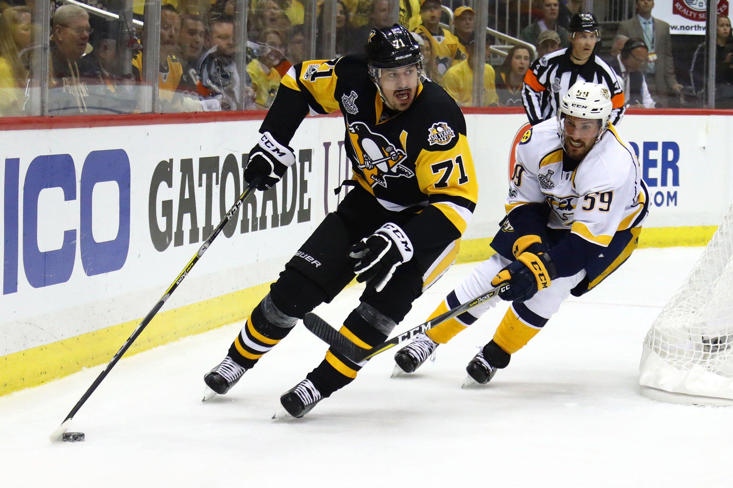 On Sunday night on the road in Nashville, the friendliest unfriendly confines in the NHL, the Penguins defeated the Nashville Predators 2–0 in Game 6 and became the first team to win back-to-back Stanley Cups since the Detroit Red Wings juggernaut did so in 1996–97 and 1997–98. It was the franchise’s fifth championship, its fifth time winning the Cup on someone else’s rink, and its fifth title team featuring at least two surefire Hall of Famers. In the early ’90s, it was Lemieux and Jaromir Jagr. These days, it’s Geno and Sid. In 25 playoff games this championship season, Malkin and Crosby combined for 18 goals and 37 assists. They anchored two separately fearsome lines that kept opposing defenses scrambling and made up for the lack of the Penguins’ own top defenseman, the injured Kris Letang. And they further established the supremacy of their forever intertwined careers.
