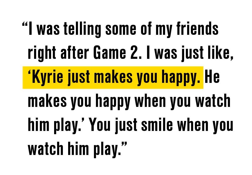 Durant: Oh my goodness, man. I was telling some of my friends right after Game 2. I was just like, "Kyrie just makes you happy. He makes you happy when you watch him play." You just smile when you watch him play. Because for somebody to be that skilled, you know he had to work tirelessly at it. The stuff he has in his package is next-level stuff that you can try to teach your kids to do, but you’ll never be able to do it. I never see anybody block his layups, and he’s 6-foot-2. I’ve never seen one person pin his layup on the glass. Not one. Because of the spin he got on it. I got so much respect for him, because I know how much work he put in to be that good. I’ve never seen nobody like him.