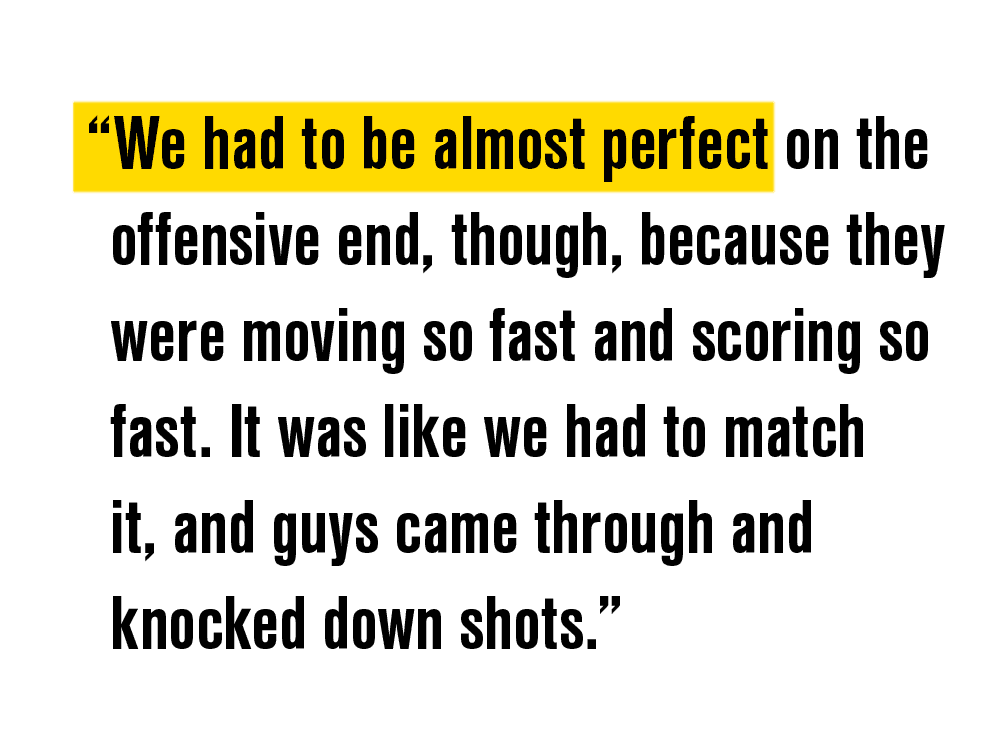 Durant: When you’re 15–0 — and we were playing well at that point — you felt like you could relax just a little bit. And that’s what we did. I’m sure ’96 Bulls at 15–0, they would’ve tried to win that game and they probably would’ve relaxed just a little bit after being up. … It’s just natural to just be like, "All right, we up 3–0 now, we could just play chess with them a little bit." And sometimes they just hit you in the mouth.