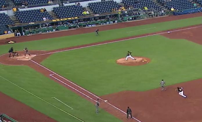 Take a game against Pittsburgh on May 31, when the Diamondbacks fought the Pirates to a 5–5 tie through 13 innings. In the top of the 14th, David Peralta led off with a single and advanced to second on a Goldschmidt groundout, which was followed by a Jake Lamb walk. With Chris Owings up, Lamb took an enormous lead — 22 feet at the time the pitch was released, according to Statcast. As Lamb explored the lead-length limits, Pirates first baseman Josh Bell broke back to the bag to set up a back-pick attempt by catcher Elias Díaz.
