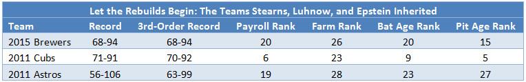 The Brewers hired David Stearns to be their GM in September 2015, which makes this his second full season on the job. The team he took over wasn’t in appreciably better shape than the pre-rebuild Astros or Cubs when Jeff Luhnow and Theo Epstein, respectively, were hired in late 2011 to shepherd those clubs back to contention. The table below compares each team’s actual and third-order records, payroll ranks, farm-system ranks (according to Baseball Prospectus) and batter and pitcher age ranks (where higher is younger) in the season before the new GMs put their stamps on their rosters.