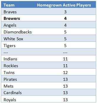 Another commonality that might be apparent from Milwaukee’s long list of useful players is how few began their pro careers with the Brewers. Of the 25 players on Milwaukee’s active roster, only four (Nelson, shortstop Orlando Arcia, and relievers Jacob Barnes and Wily Peralta) are homegrown — that is, either drafted or signed as amateur free agents by the Brewers. Only the Braves have fewer active homegrown players. Even the Brewers’ top three prospects this spring, and four of the top five (according to Baseball America), were imports from other organizations.