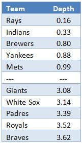 We can quantify depth. Adam Guttridge and David Ogren, cofounders of the Neifi player-evaluation system — and, coincidentally, a former full-time employee of and consultant to the Brewers, albeit before Stearns’s hiring — have developed a measure of depth that adds up each player’s projected full-season wins below the halfway point between replacement level and average, and then combines those individual totals into a cumulative team figure. Anyone above that threshold (which is meant to approximate the talent level of a serviceable bench player) doesn’t detract from the team’s depth rating. The lower the number, the less dead weight the team is carrying on its roster. By this metric, the Brewers have the fewest holes (if not the highest highs) of any NL team.