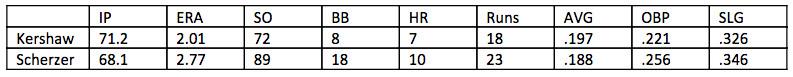 This year, Scherzer and Kershaw have thrown about the same number of innings (107.2 for Scherzer, 109.1 for Kershaw), and allowed almost the exact same number of runs (31 for Scherzer, 32 for Kershaw). Kershaw’s allowed 20 more hits, but Scherzer’s allowed 14 more batters to reach by walk or hit-by-pitch. Almost the entire difference between the two has been in Scherzer striking out more batters and allowing fewer extra-base hits — a 0.4 HR/9 edge and a 2.0 K/9 edge, both of which are significant over the course of a season, but not so significant that Kershaw can’t claw back to parity over the second half of the season.