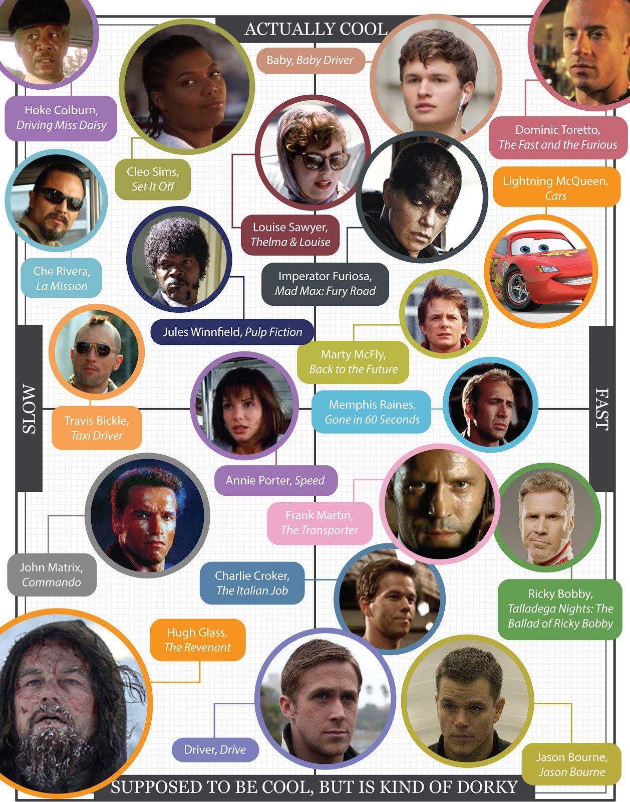 The Movie Driver Skill Matrix plots drivers from movies on a matrix based on what are, I would argue, the two most important variables about a person driving in a movie: does the driver drive fast or slow, and is the driver actually cool or is the driver supposed to be cool but is actually kind of dorky. The matrix, as matrices tend to, raises some questions:
