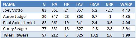 Here are the five most valuable position players in baseball through Tuesday’s games, according to Baseball Prospectus’s wins above replacement player. TAv is true average, an all-in-one offensive stat on roughly the same scale as batting average (in other words, .300 is good). FRAA is fielding runs above average; BRR is baserunning runs; and WARP — the only one of the win-value stats that incorporates catcher receiving — is a player’s complete contribution boiled down to one number.