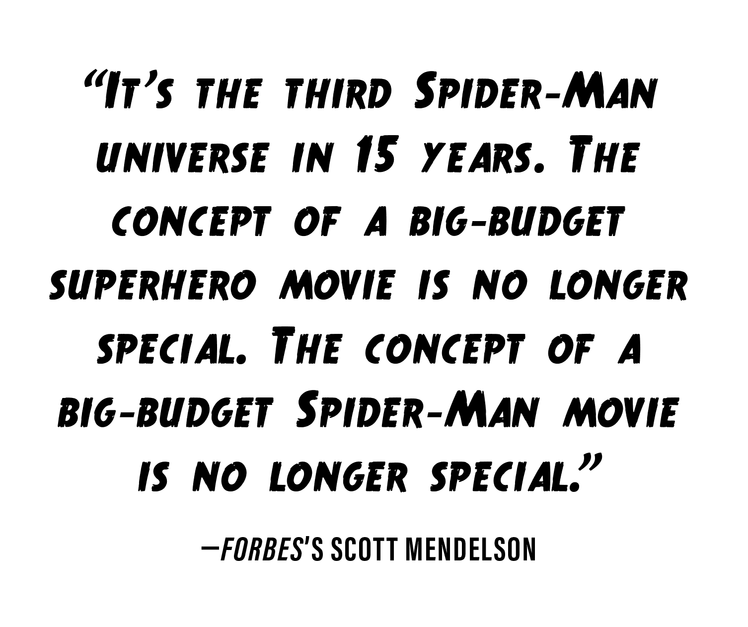 "It’s the third Spider-Man universe in 15 years," Mendelson said. "The concept of a big-budget superhero movie is no longer special. The concept of a big-budget Spider-Man movie is no longer special."