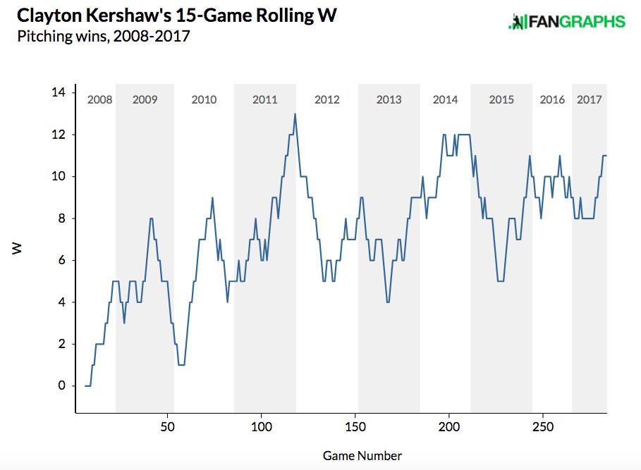 Kershaw has made 282 starts in his career, giving him 268 stretches of 15 starts. He’s won at least 11 games in 31 of those chunks, offering a historical 12 percent success rate for this particular target; since he started winning Cy Youngs in 2011, he has a 17 percent success rate for 11 wins in 15 starts. By his own precedent, Kershaw has about a one-in-six chance of winning 25 games this year. I wouldn’t bet on it, but it’s Kershaw, so I wouldn’t bet against him either.