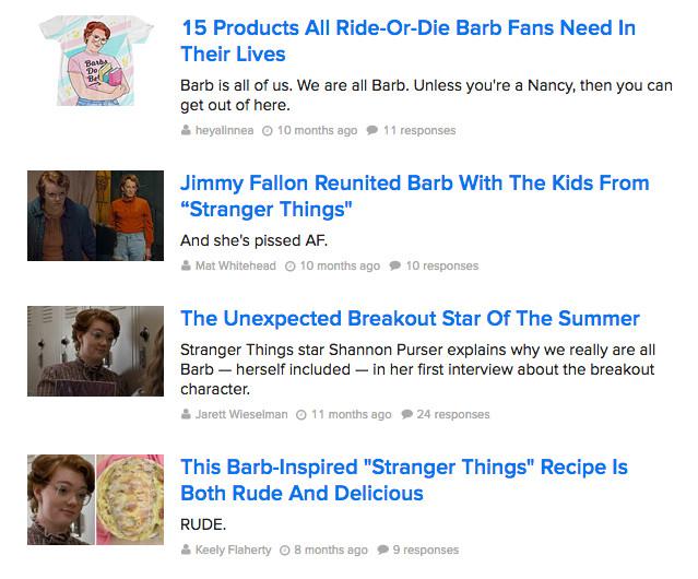 "What about Barb?" became a rallying cry online, and, as things go around here, the grassroots movement on Twitter quickly morphed into a page views ploy. Months after Stranger Things was released, outlets were still churning out content solely focused on Barb.