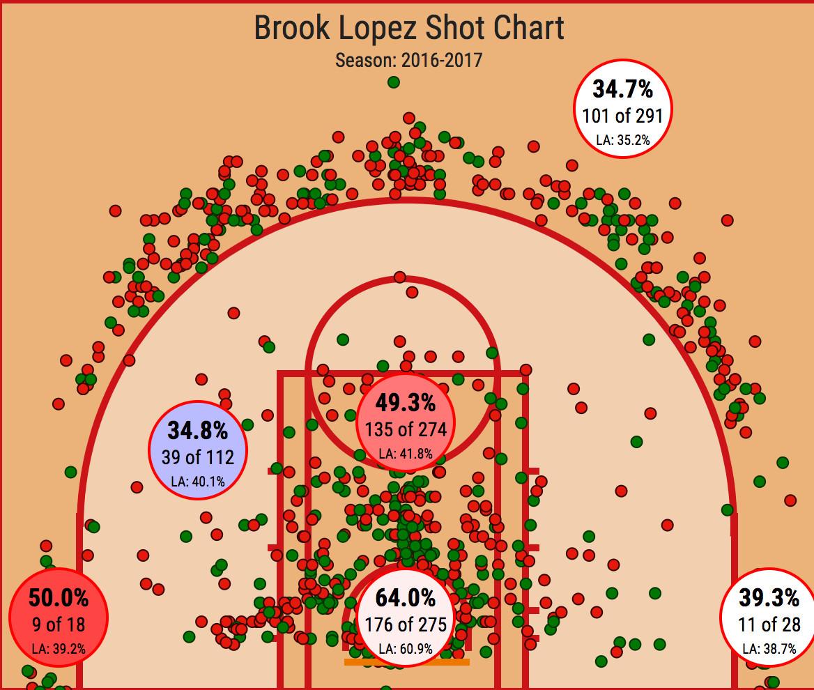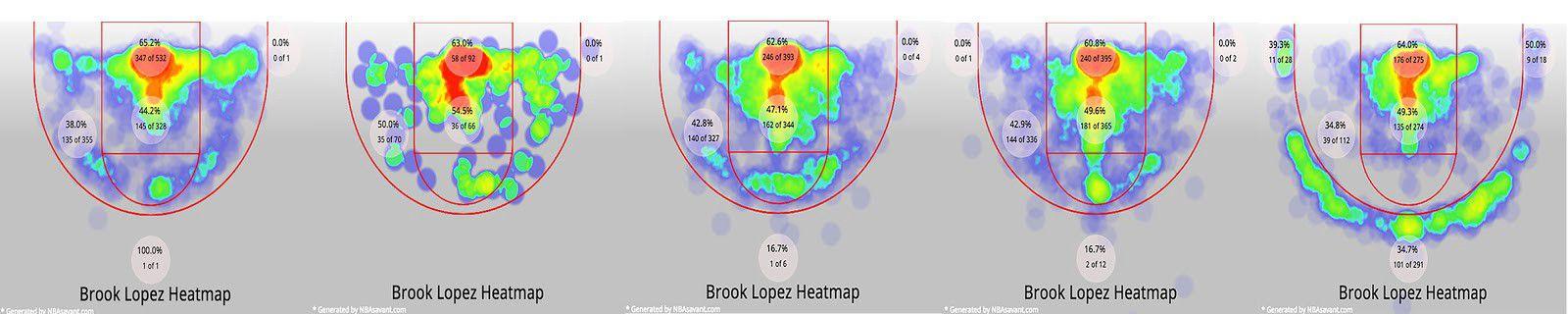 Feast your eyes on this heat map of Lopez’s shot attempts in the past five years of his career. In 2012–13, Lopez ventured to the 3-point line only once. In 2013–14, he didn’t even bother going there at all. 2014 and 2015 were years of rare appearances in that region of the court. It wasn’t until this past season that Lopez really decreased his presence in the midrange and increased it in the strange lands beyond the arc.