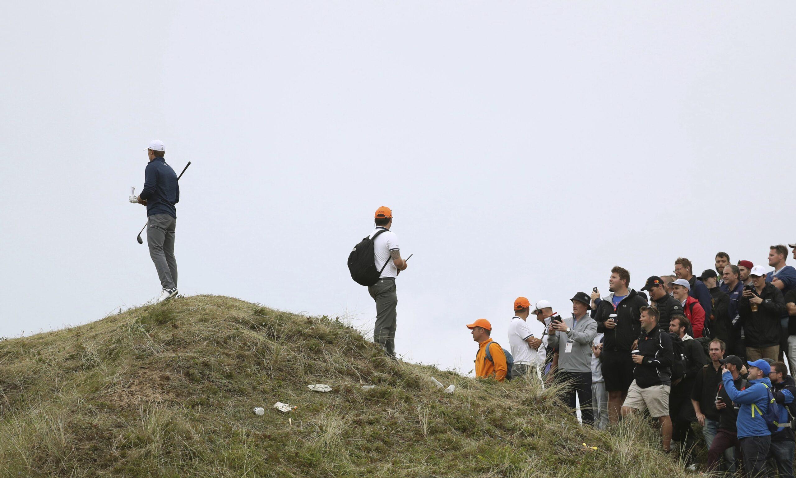 But it was the craziest scene that I think I’ve really ever witnessed in person, starting with the tee shot on 13. … [Spieth] hit a nice shot on 12, which was a beautiful par 3. … And then on 13 he just ballooned it right, and they had us, the press, stand back on a dune that’ll probably be a tee the next time they come [to Royal Birkdale]. It was into the wind and brutal — just a beautiful hole, though. … And [after Spieth’s first shot] I said, "That’s on the top of the dune!" And then you saw this [spectator] just go down and … he got hit in the head, it turns out. … So I walked down the right side [of the hole] with a bunch of people and sure enough there [the ball] was, down the hill. But I first went up the side, and Spieth started looking for it and everybody was trying to convince him it was over on the other side of the dune. For whatever reason, off the tee, I just don’t think he saw that or believed it. It was kind of peculiar. It is easy to lose sight of the ball out here, for sure. There’s no question that it is gray skies and all that. And then from there it was just surreal.